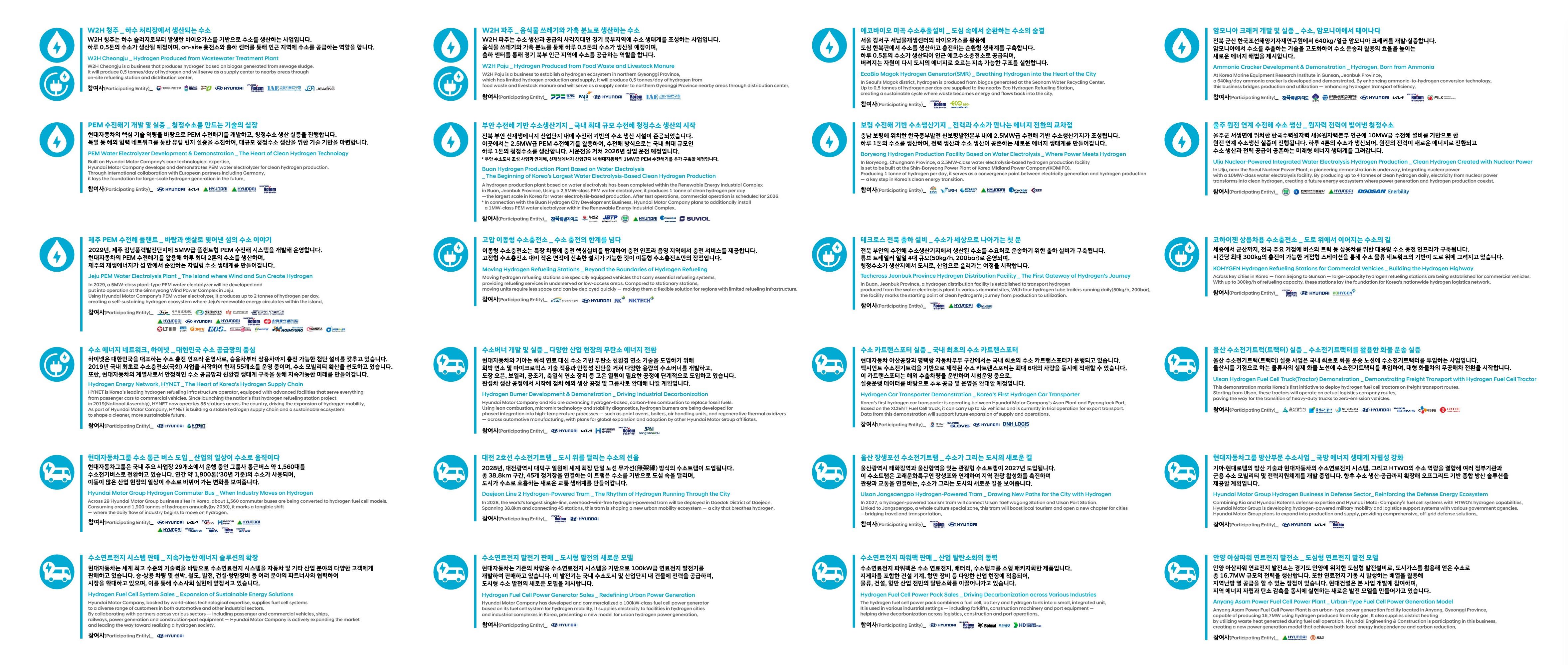 현대자동차그룹은 리드 스폰서로 참여해 현대자동차, 기아, 현대제철, 현대건설, 현대엔지니어링, 현대글로비스, 현대로템, 7개 그룹사와 함께 다양한 수소 기술과 사업을 선보입니다.