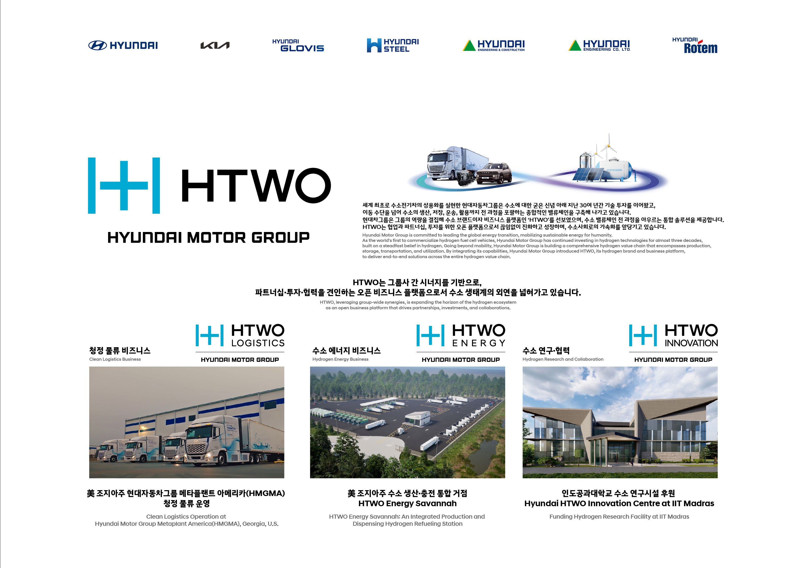 현대자동차그룹은 리드 스폰서로 참여해 현대자동차, 기아, 현대제철, 현대건설, 현대엔지니어링, 현대글로비스, 현대로템, 7개 그룹사와 함께 다양한 수소 기술과 사업을 선보입니다.